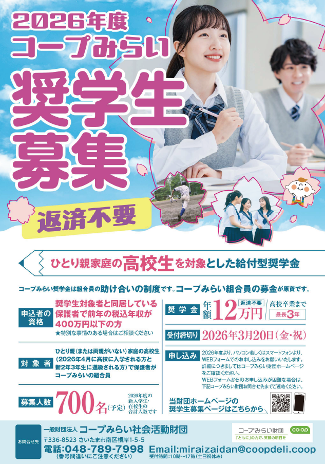 一般財団法人コープみらい社会活動財団による2026年度「コープみらい奨学金」奨学生募集のご紹介です。この奨学金は組合員の助け合いの制度です。「奨学金応援サポーター(奨学生を応援するコープみらい組合員)」の募金を原資としています。