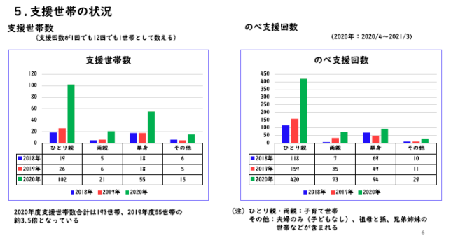 この1年間に扱った食品の入出庫量や支援状況を数字とグラフでまとめました。下の画像をクリックすると全内容がご覧になれます。食品の扱い量は、2019年度と比べて約2.3倍、支援世帯数は約3.5倍、支援回数は約2.5倍となっています。この資料は、「えがお通信&資料」の項に置いています。