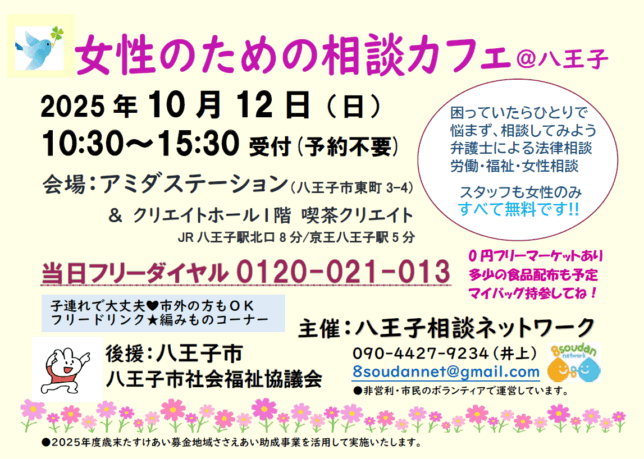 10月12日(日)10:30~15:30 上記チラシのとおり、「女性のための相談カフェ」がアミダステーション、クリエイトホール内「喫茶クリエイト」で開催されます。